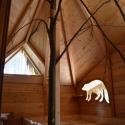 Dřevostavba v menším svahu, instalovaná na malých pilotech, interiér oddělen příčkou.