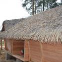 Dřevostavba v menším svahu, instalovaná na malých pilotech, interiér oddělen příčkou.